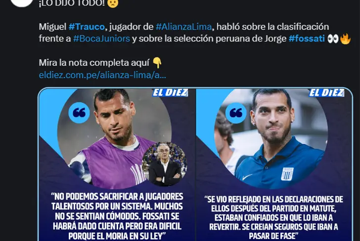 “Ese sistema no lo veo bien. Soy un jugador lento y en esa posición se necesitan aviones. Lo podía hacer, en Francia jugué ahí. Es un sistema que no me gusta mucho, y para serte sincero, teniendo a Marcos (López) prefiero que juegue él”, indicó Trauco. El lateral izquierdo considera que el sistema de Fossati, que priorizaba la velocidad y el despliegue físico, no le permitía explotar sus cualidades. Además, Trauco señaló que la presencia de Marcos López, un jugador con características similares, hacía innecesaria su participación en el equipo titular.