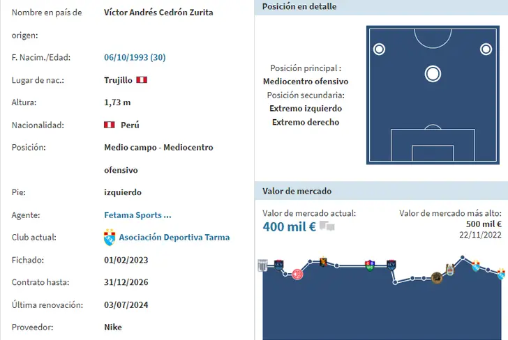 Víctor Cedrón, volante peruano de 30 años, tiene una cotización monetaria de 400 mil euros, lo que en soles daría un promedio cercano a los 1,6 millones, según la web especializada 'Transfermarkt'. Veremos si finalmente el popular 'Vican' se mantiene con estos buenos rendimientos con la camiseta del ADT de Tarma en este Torneo Clausura 2024 y desde Videna, especialmente el profesor Jorge Fossati junto a su comando técnico, lo tienen en cuenta para la convocatoria del mes de septiembre cuando la Selección Peruana enfrente a Colombia en Lima y a Ecuador en Quito.