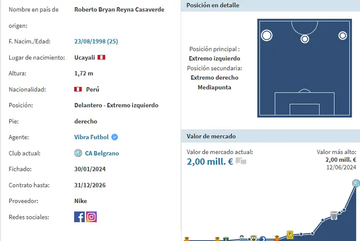 El atacante nacional de 25 años tiene una cotización monetaria de 2 millones de euros, lo que en soles daría un promedio cercano a los 8 millones, de acuerdo al portal especializado ´Transfermarkt´. A pesar de no haber tenido actividad recientemente con la Selección Peruana, sus buenos rendimientos con la camiseta del Belgrano de Córdoba han ocasionado que pueda dar un salto de calidad en su ficha internacional, así que de continuar por este camino podría progresar muchísimo más.
