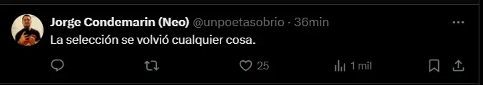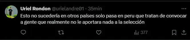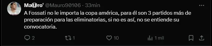 "La selección se volvió cualquier cosa", "A Fossati no le importa la Copa América, para él son 3 partidos más de preparación para las Eliminatorias, si no es así, no se entiende su convocatoria", "Despues nos preguntamos porque no hay mas cuando llevan a jugadores sin equipo y que no han jugado un partido en el 2024", "Esto no sucedería en otros países solo pasa en Perú que tratan de convocar a gente que realmente no le aportara nada a la selección" y "De perder Perú sus 3 partidos de la Copa América, que es lo más probable, no habrá necesidad que la FPF despida al Nono, el mismo Fossati renunciará"; son algunos de los comentarios más llamativos