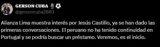 " Alianza Lima muestra interés por Jesús Castillo, ya se han dado las primeras conversaciones. El peruano no ha tenido continuidad en Portugal y se podría buscar un préstamo. Veremos, es el inicio", dio a conocer Gerson Cuba en sus redes sociales, por lo que podría ser una buena oportunidad para que Alianza Lima sume un nuevo jugador importante.