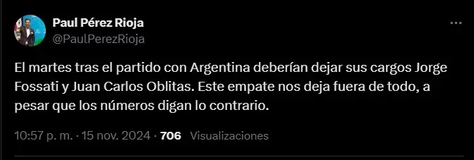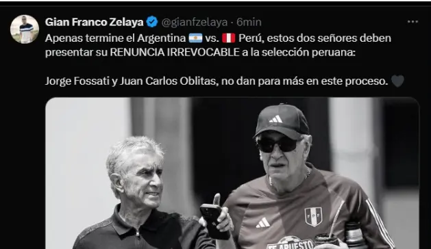 El futuro de Jorge Fossati y Juan Carlos Oblitas en la Selección Peruana está en juego. El resultado del partido ante Argentina podría ser determinante para su continuidad. Sin embargo, más allá del resultado, es evidente que la Selección Peruana necesita un cambio profundo y que la salida de ambos dirigentes podría ser el primer paso para iniciar una nueva etapa.