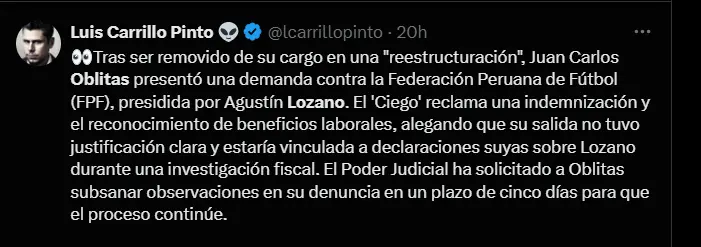 Según se conoció, la denuncia fue formalizada luego de que Juan Carlos Oblitas considerara que su salida fue injustificada y decidida de forma unilateral por Agustín Lozano. El caso ha sido elevado al Poder Judicial, que ya emitió una resolución inicial: la demanda fue declarada inadmisible por aspectos formales, pero el proceso no ha sido cerrado. El equipo legal de Oblitas tiene un plazo de cinco días para corregir las observaciones y continuar con la acción legal.