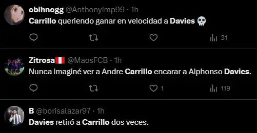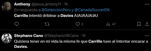 Todo esto ocurrió en los últimos minutos de la contienda, la Selección Peruana estaba buscando la opción del gol del empate, por lo que André Carrillo vio una oportunidad, pensó que como en los viejos tiempos, tratar de ganar por velocidad, pero Alphonso Davies lo puso en la tierra, pues apenas quiso hacer uso de su velocidad, este se posicionó mejor, robando el balón y saliendo en una útil contra para el cuadro de Canadá, dejando humillado al peruano.