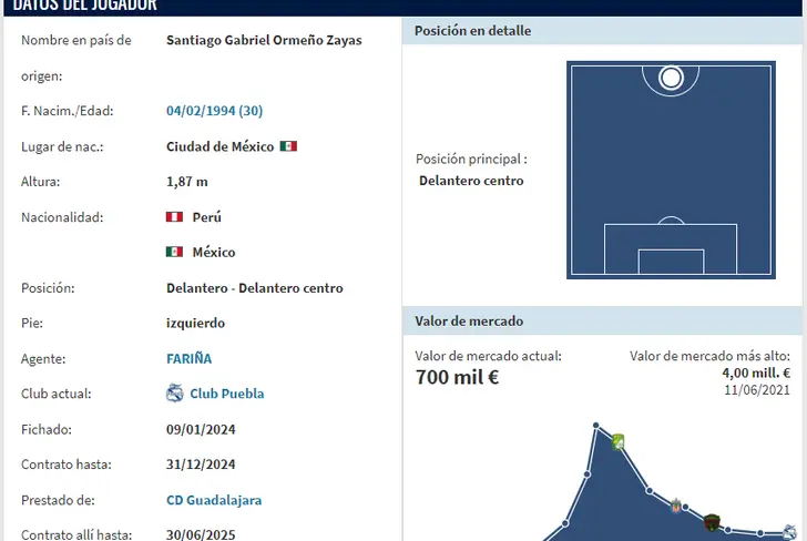 Santiago Ormeño, delantero mexicano-peruano de 30 años, tiene una cotización internacional de 700 mil euros, lo que en soles daría un promedio cercano a los 2,8 millones, según la web especializada 'Transfermarkt'. De esta manera queda comprobado que tampoco en el factor económico pasa por su mejor momento al resaltar que en el año 2021 costó 4 millones de euros cuando jugaba también en el Club Puebla de México y ahora en el mismo club atraviesa un momento no tan bueno.