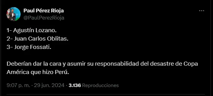 “Agustín Lozano, Juan Carlos Oblitas y Jorge Fossati. Deberían dar la cara y asumir su responsabilidad del desastre de Copa América que hizo Perú”; fue la más reciente revelación del reconocido comunicador deportivo Paul Perez a través de su cuenta de twitter en relación a que desde la interna de la Federación Peruana de Fútbol también tendrían que dar sus impresiones y sobre todo explicaciones de lo que viene ocurriendo desde hace un buen rato con el equipo de todos.